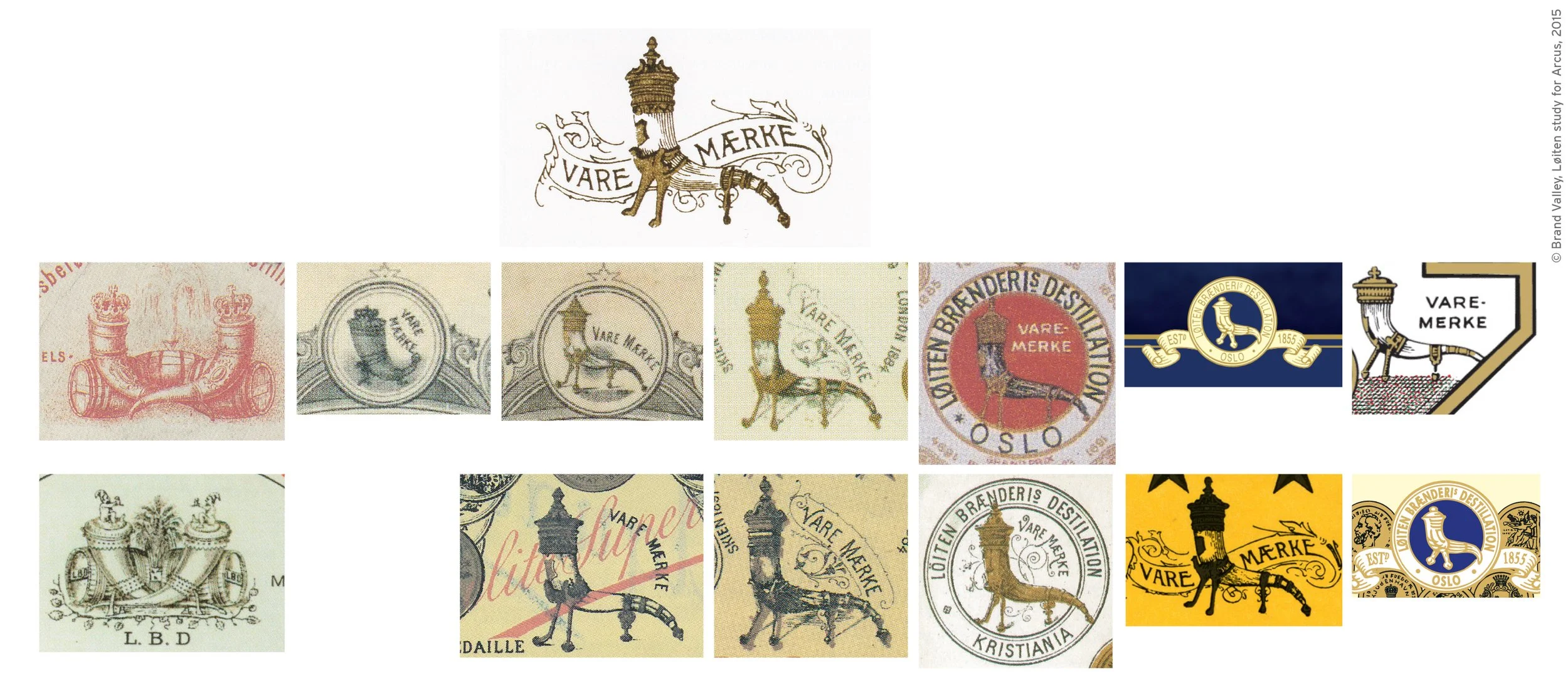 To fully understand Løiten’s meaning, historical sources were reviewed. We visited the National Library and the National Archives to find all elements of the brand. One finding was that key elements had disappeared from the labels over time. A specific discovery was that the drinking horn turned out to be the original trademark, but it had lost its significance over a century and a half of redesign (Figure 2).